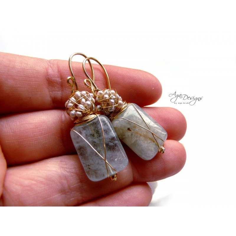 On the top of the aquamarine stone is a cluster of light silver sea pearls. Hand created 14 gold filled ear wires are easy to wear for beautiful instant glamor!