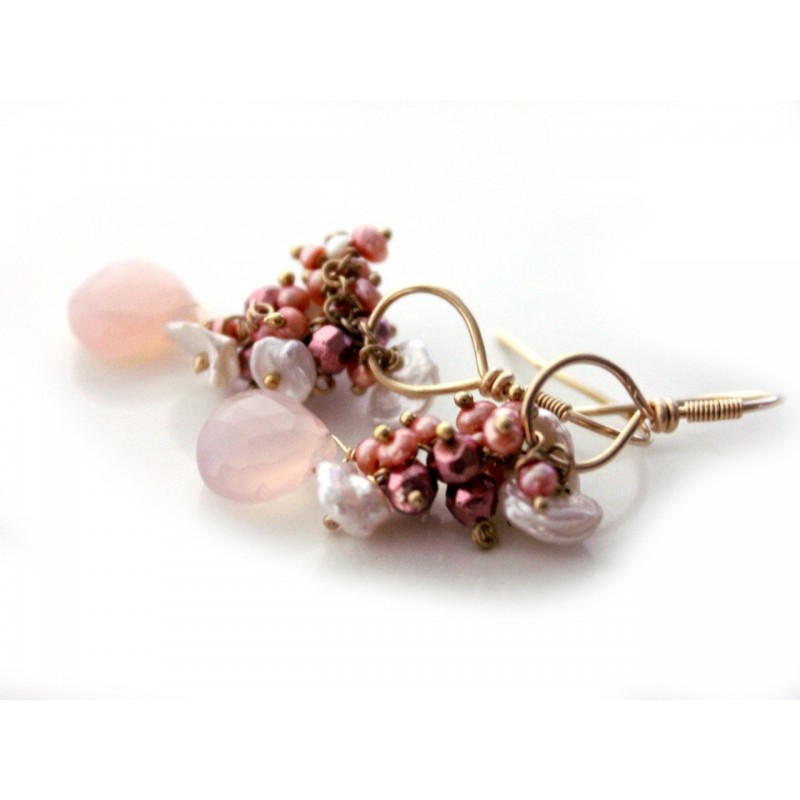 On the bottom of the cluster with Pink Pyrite Stones and White Pearls are beautiful faceted Light Pink Chalcedony stones. Hand created gold filled ear wires are easy to wear for beautiful instant glamor!