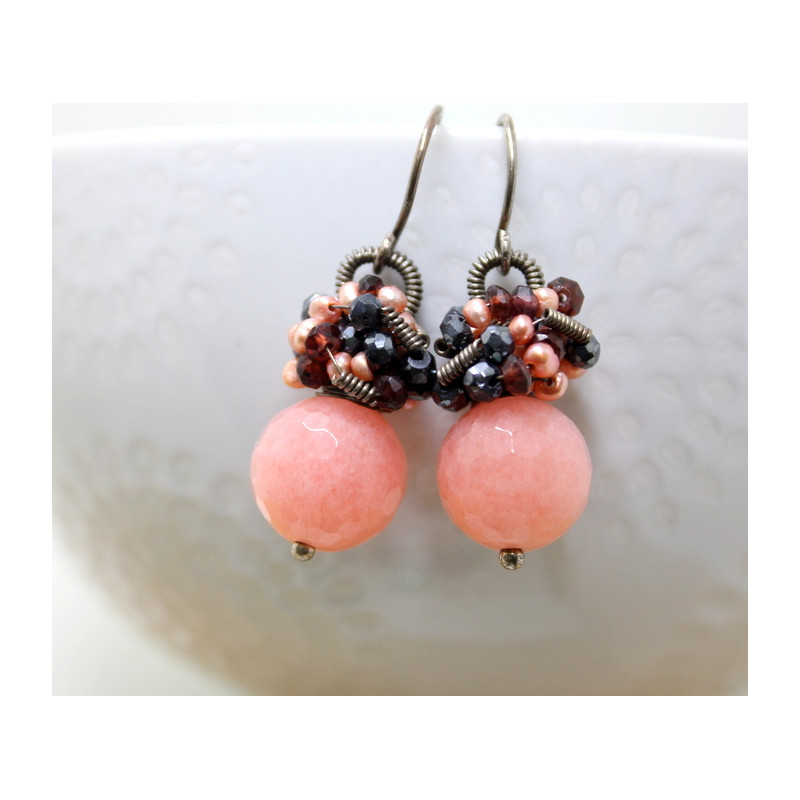 The earrings feature Peach Chalcedony faceted round stones with Garnet, Pyrite and Pearls. All wire wrapped in Sterling Silver wire.